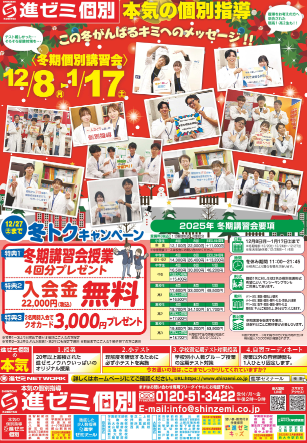 ホーム校舎ブログ【進ゼミ個別学園前本部校】☆★冬期講習キャンペーンのお知らせ★☆