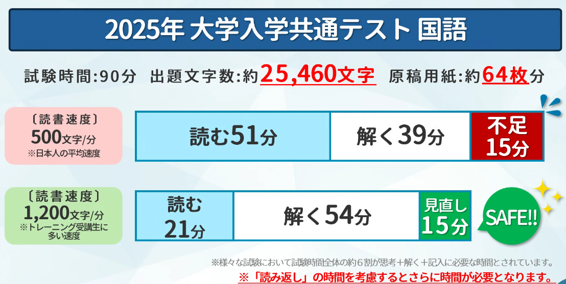 合わせて入試問題等の文章量も多くなっており、大学受験ではおよそ原稿用紙64枚分の問題が出ました。日本人の平均読書速度だと読むだけで51分も取られてしまいます。
