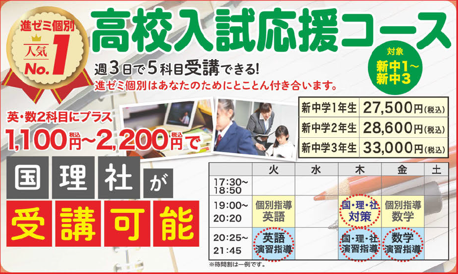 テストの2週間前から学校別に定期テスト対策を行います。対策授業では各学校の出題傾向をふまえながら、正答率を高めておくべき問題を反復していきます。また2週間のテスト勉強が円滑に進むように、生徒面談やテスト勉強会を実施し勉強のリズムを作っていきます。豊富なデータに基づいた授業と定期テスト対策に集中できる環境が進ゼミ個別のテスト対策の魅力です。